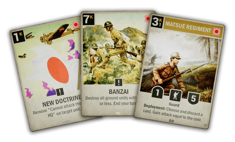 Le Régiment de Matsue étend le thème de la défausse pour le Japon avec une capacité puissante. Matsue gagne un bonus d'attaque égal au coût de la carte défaussée. Cela pourrait conduire à des unités puissantes tôt dans la bataille. Attention !