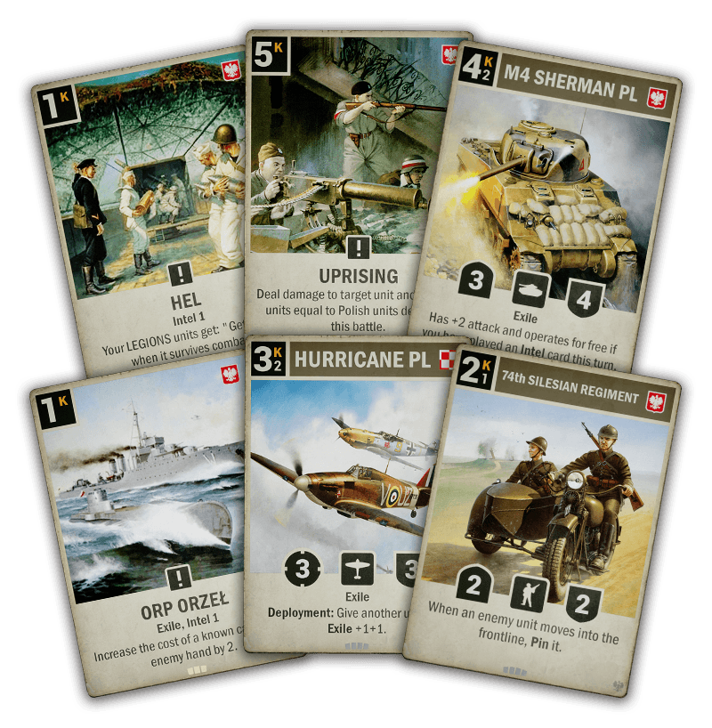 ORP Orzeł et Hel, deux nouveaux ordres polonais, élargissent le gameplay de Renseignement. Alors que l'ORP Orzel augmente le coût d'une carte révélée dans la main ennemie, Hel renforce toutes les légions du plateau en leur conférant une capacité spéciale.