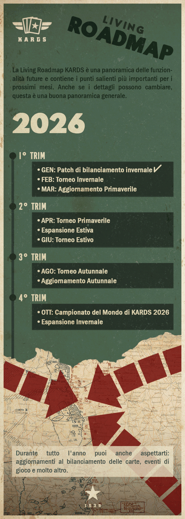 Non elenca tutte le patch regolari, gli aggiornamenti minori, le modifiche al bilanciamento o gli eventi di gioco. Questi sono ancora parte integrante del nostro sforzo per migliorare KARDS, ma la tabella di marcia è pensata per rimanere leggibile e focalizzata sulla campagna complessiva piuttosto che su ogni singola operazione.