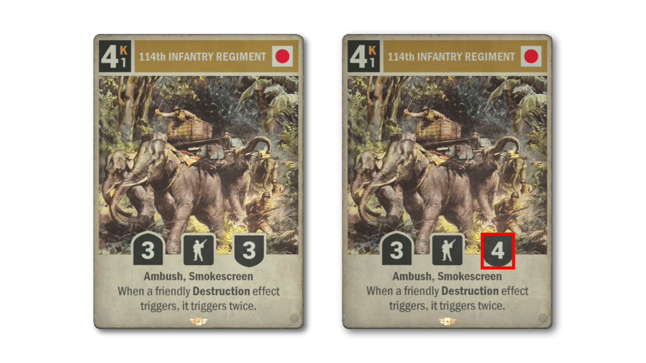 A proposito di effetti di Distruzione, per i mazzi basati sulla Distruzione, il 114° REG. FANTERIA è sempre stato l'elefante mancante dalla stanza. Ora che ha un fondoschiena più grande, ha maggiori possibilità di rimanere nella stanza più a lungo per esercitare il suo potere distruttivo.