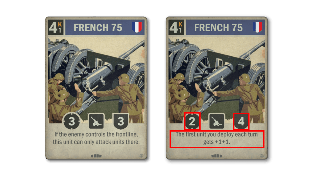 Le carte francesi hanno avuto un buon tasso di successo nel trovare la loro strada nei mazzi meta. La FRANCESE 75 non è una di queste. Mentre ha statistiche decenti per un'artiglieria, la sua abilità debilitante non si adatta alle strategie francesi esistenti, per non parlare della rimozione dell'intera raison d’être di un'unità d'artiglieria. La nuova versione si adatta meglio alla Francia moderna e, sebbene ora colpisca meno duramente, rimane più resiliente con la sua difesa aumentata.