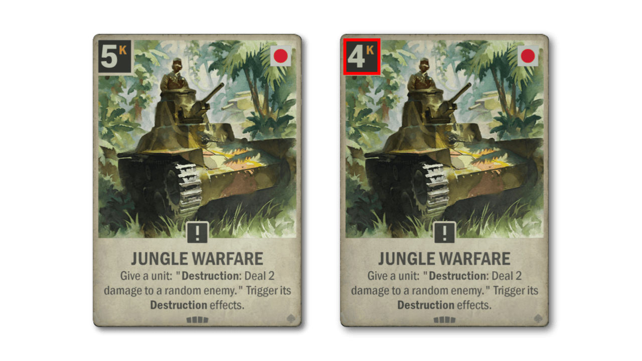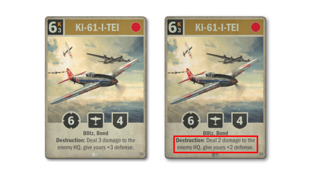 L'ultima carta che vede un nerf è il Ki-61-I-TEI. Una delle migliori carte di Fronte Interno, che ha immediatamente riempito il vuoto di potere lasciato da N1K-J SHIDEN tempo fa. Riempito un po' troppo bene; l'effetto di Distruzione in aggiunta alle statistiche importanti e l'abilità Blitz ha creato un po' troppa inevitabilità, quindi stiamo riducendo leggermente l'effetto di Distruzione.
