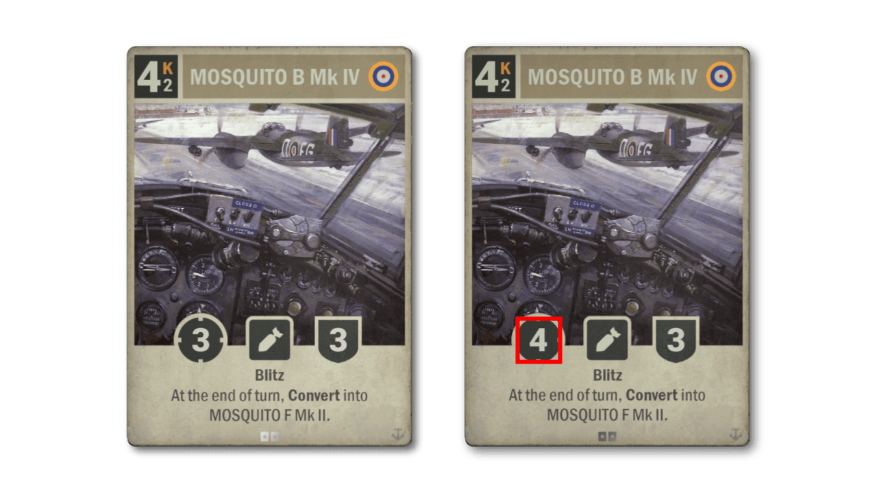 La Gran Bretagna è la nazione principale meno giocata, anche se è migliorata un po' nell'ultimo anno. Tuttavia, gli unici mazzi britannici davvero fattibili sono quelli che usano BUFF come condizione di vittoria. Riteniamo che ci sia spazio per spingere strategie britanniche più lente, da qui questo miglioramento del bombardiere. La versione caccia rimane la stessa, ma il bombardiere ora picchia un po' più forte.