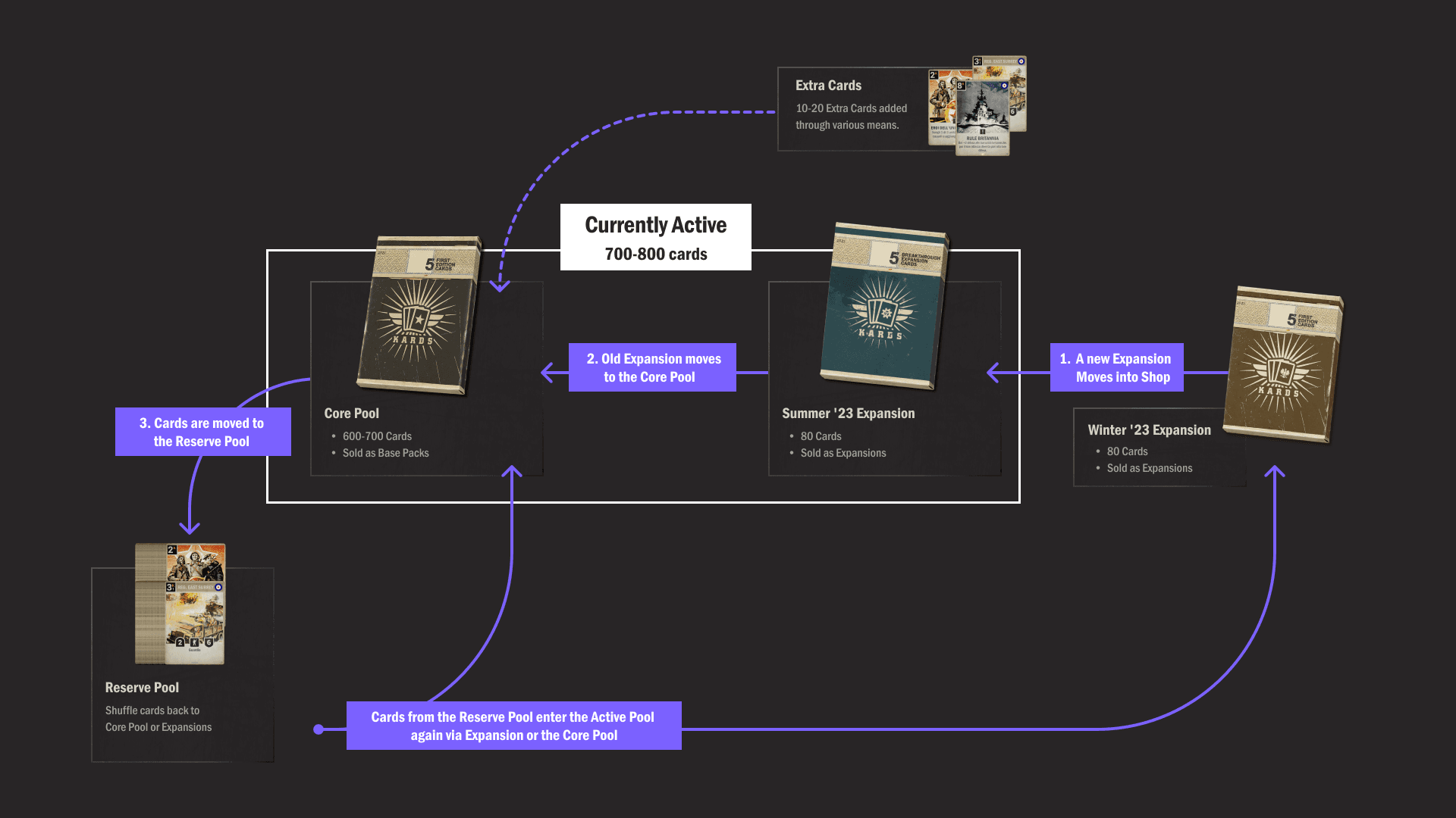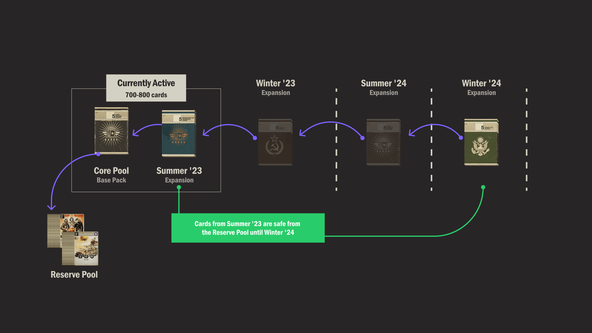 One thing that is very important is for players to have faith in having the time to enjoy new cards they buy. So cards in new sets will be exempt from rotation for a time. Only cards in the Core set go to the Reserve Pool. When a set moves into Core, then none of its cards go into Reserve. On the next rotation, these cards are safe as well. It is only on the 2nd rotation after the cards became part of Core that the cards can be moved to Reserve. For example, Legions is currently the newest set. When the Summer expansion drops, Legions cards will be moved into Core, but none of them will be moved to the Reserve Pool. When the Winter ‘23 expansion drops, Legions cards are still not touched. It is only when the first expansion of ‘24 drops that cards in the Legions set can go to the Reserve Pool. This means that cards in the Summer expansion will definitely be playable until the 2nd expansion of ‘24 at the very least. Exceptions can be made in extreme cases, but we don’t foresee needing to do this often (if at all). To understand this process a bit better, here is a diagram for your viewing pleasure: