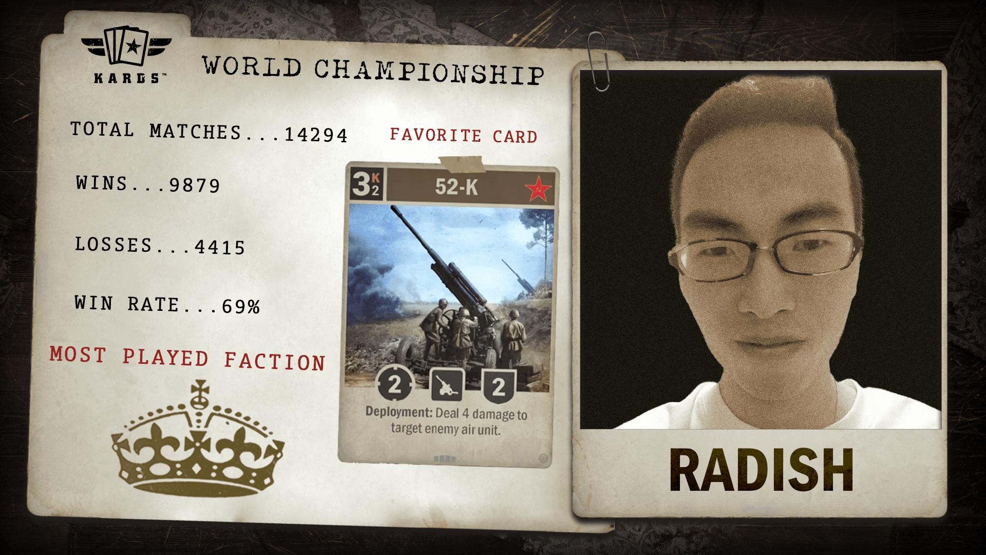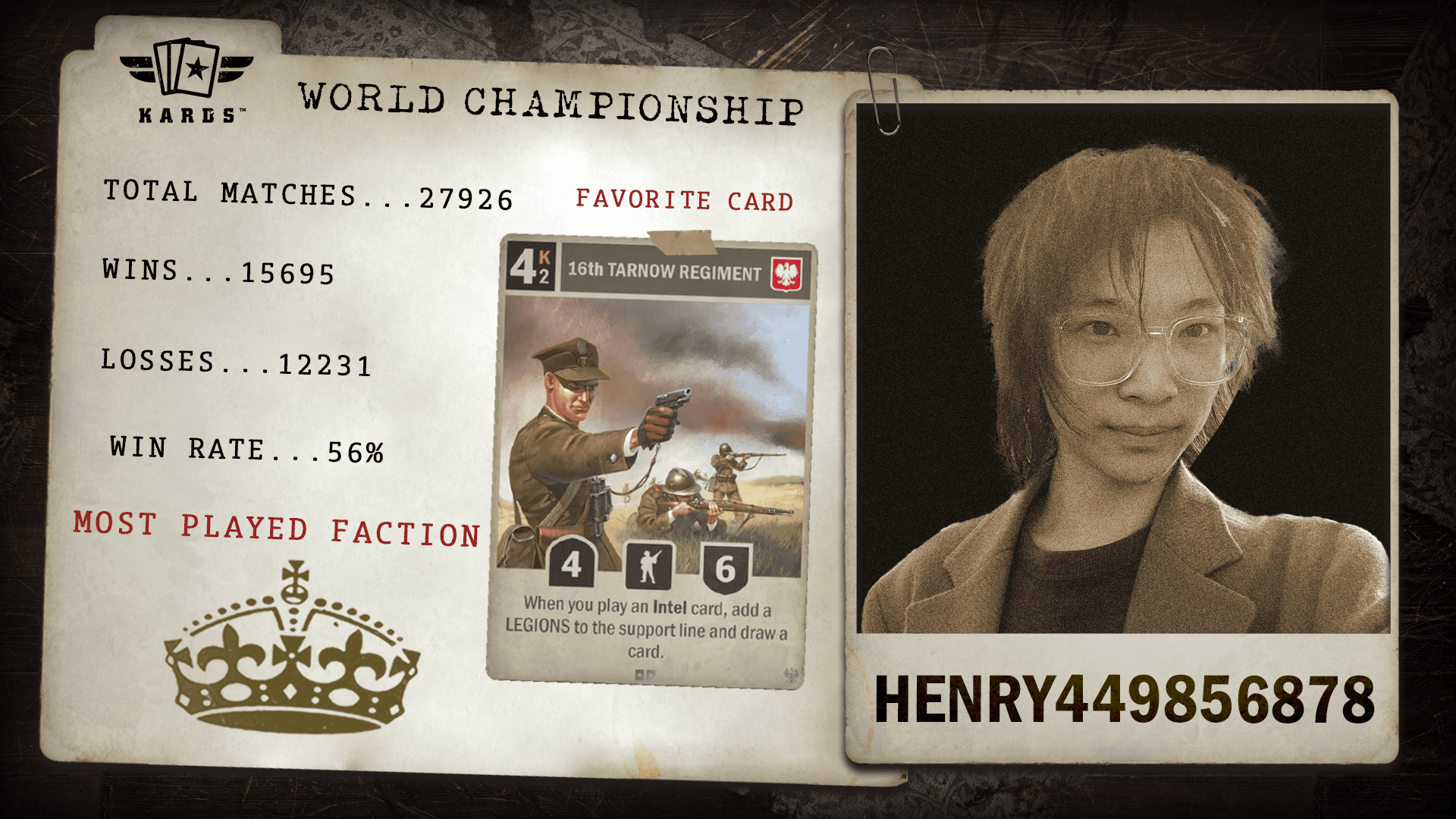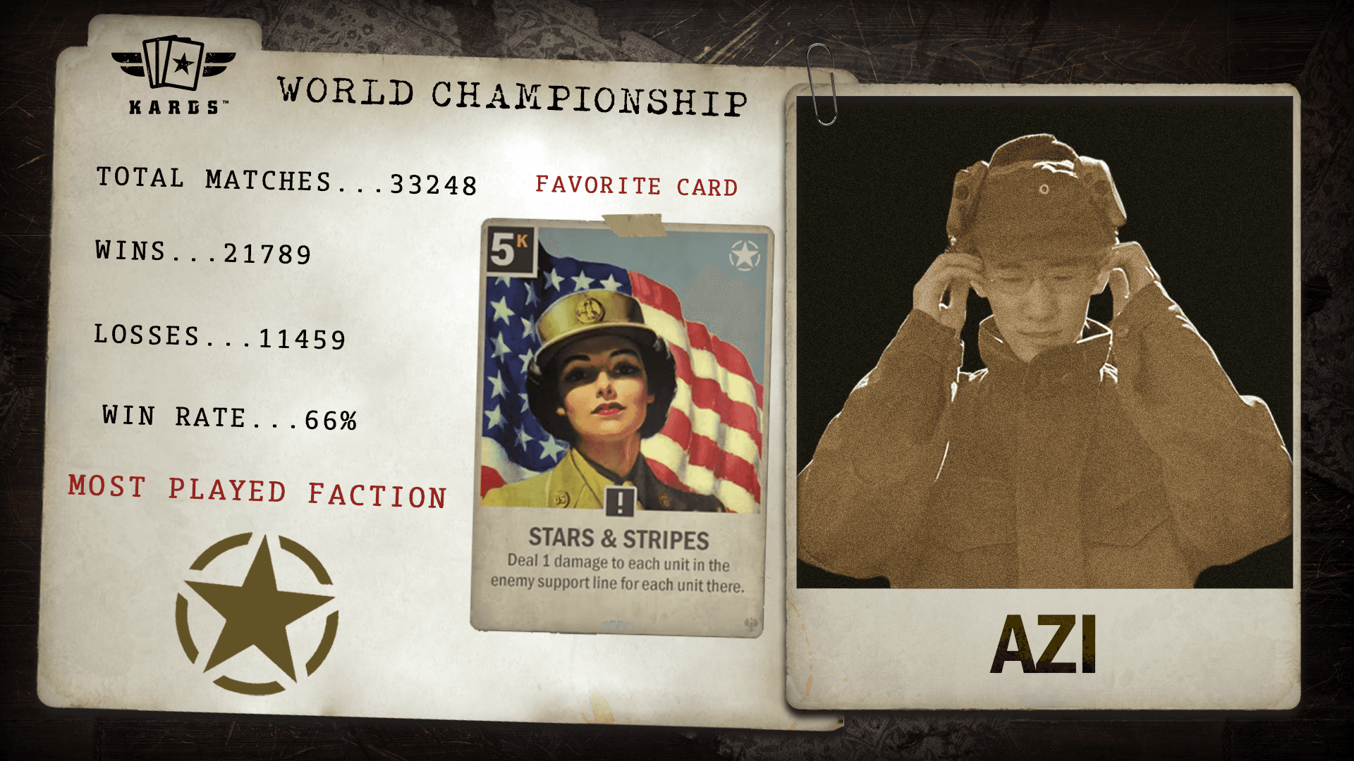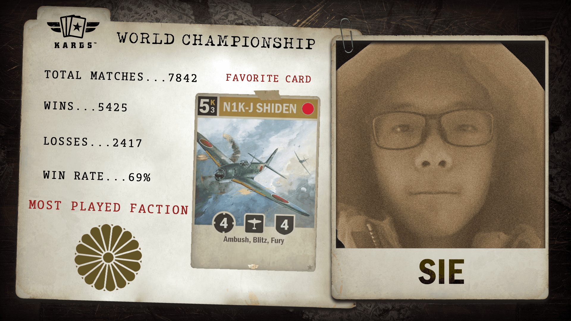 Jeden z najbardziej doświadczonych zawodników w tegorocznym składzie, 变成光守护阿梓公主 (Azi), rozegrał ponad 33000 meczów od momentu dołączenia do gry w KARDS w 2019 roku - przed pełnym wydaniem gry na Steam. Przy wskaźniku wygranych 65,5% ten zawodnik wnosi zarówno doświadczenie weterana, jak i spójną doskonałość na arenę mistrzostw świata.