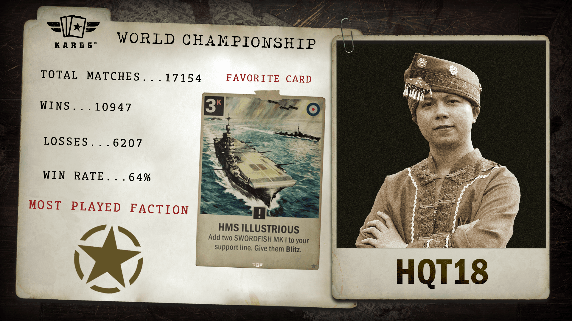 Kwalifikując się poprzez turniej Krew i żelazo, hqt18 wykazał się konsekwentną formą, która charakteryzuje najlepszych dowódców. Z ponad 17000 rozegranymi meczami i 63,8% wskaźnikiem zwycięstw, wnosi stabilne doświadczenie na arenę Mistrzostw Świata.