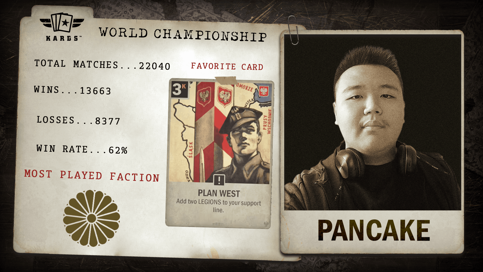 Kwalifikując się przez turniej Krew i żelazo, 煎饼1 (Pancake) wkracza do mistrzostwa świata z niezwykłym doświadczeniem, rozgrywając ponad 22000 meczów. Jego konsekwentne działanie i długotrwałe poświęcenie sprawiają, że jest jednym z najbardziej sprawdzonych dowódców na placu boju.