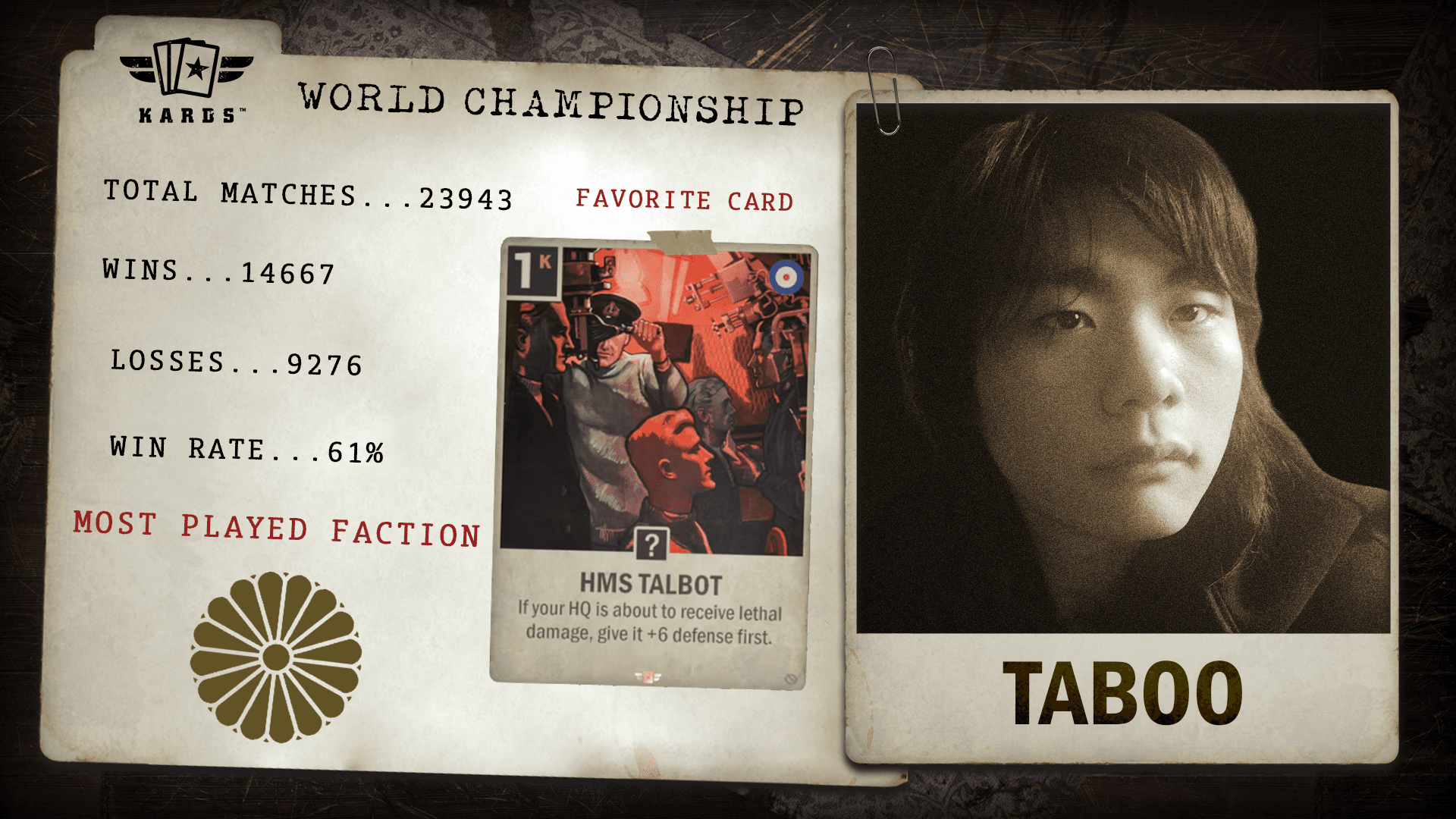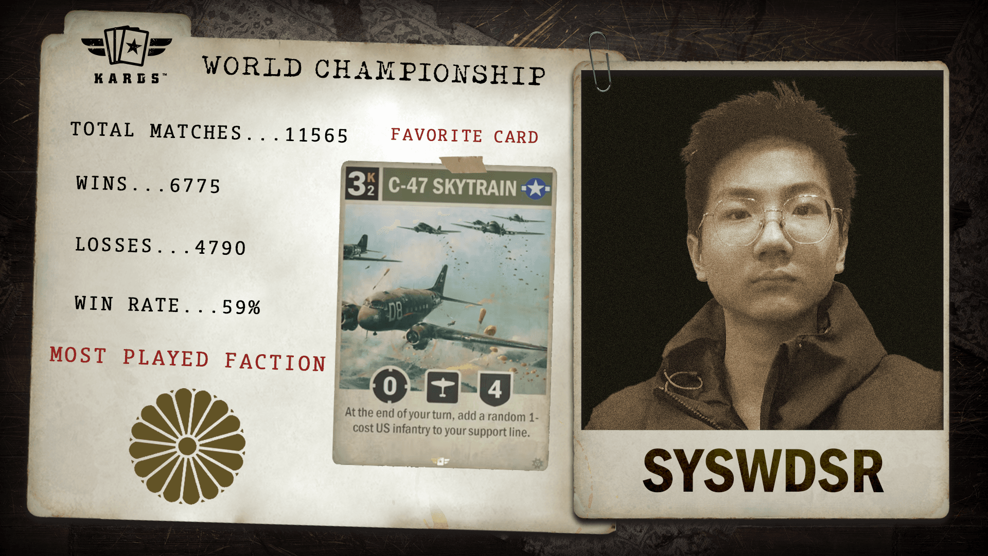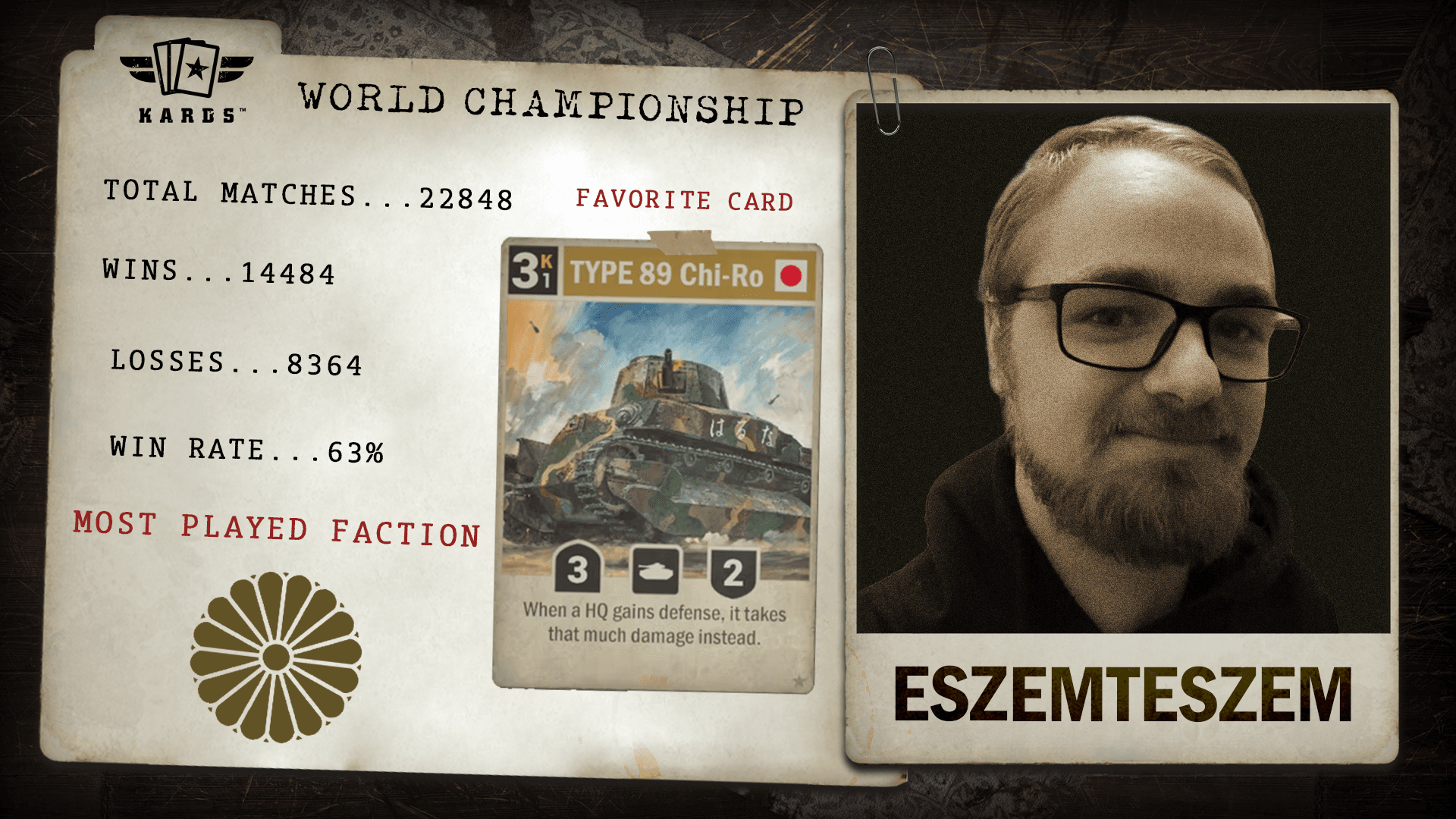 Rozgrywając ponad 22000 meczów od 2019 roku, eszemteszem jest jednym z najbardziej doświadczonych dowódców w KARDS. Z 63,4% wskaźnikiem wygranych i stałymi wynikami przez lata gry, wnosi do mistrzostw świata ugruntowaną stabilność i długą historię rywalizacji.