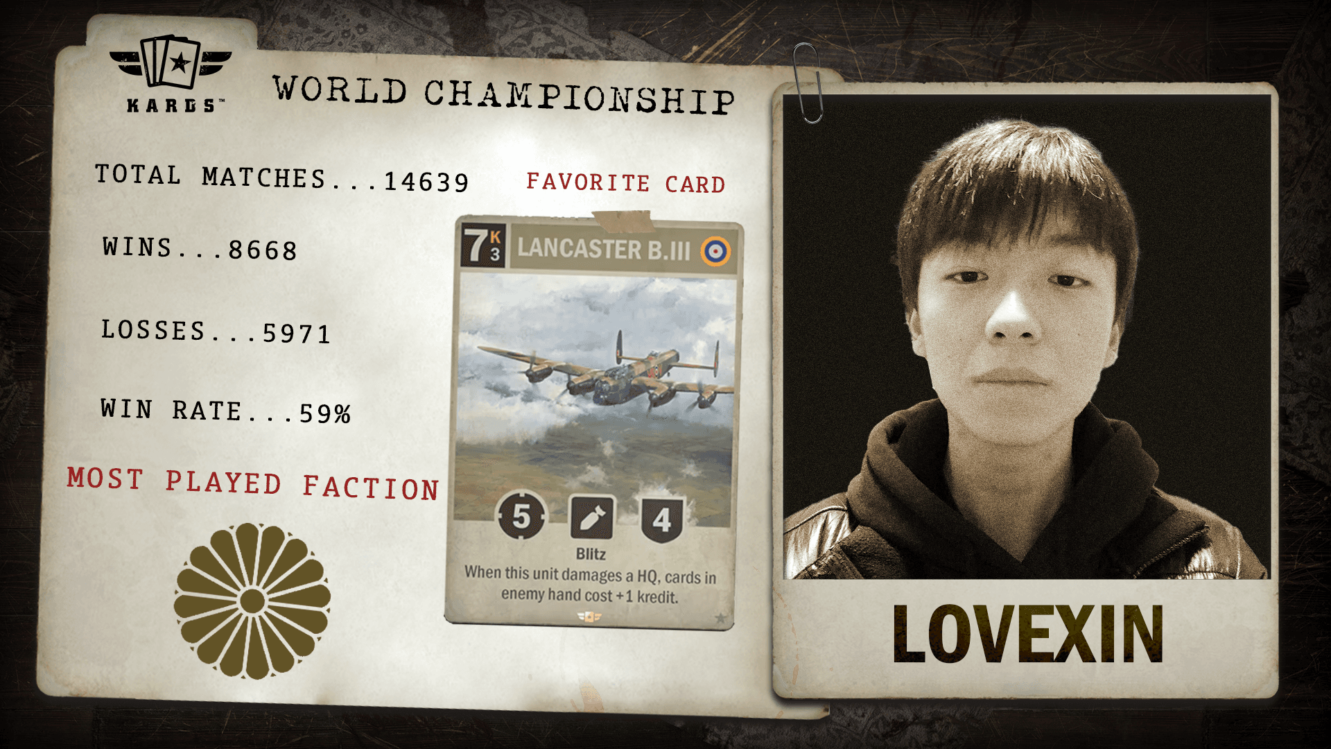 爱欣欣欣欣 (Lovexin) wchodzi do finałów z solidnym rekordem 8668 zwycięstw i wskaźnikiem wygranych na poziomie 59,2% w ponad 14000 meczach. Od początku swojej przygody z KARDS we wrześniu 2023 roku Lovexin wykazuje stałą formę i stały postęp dzięki grze rankingowej i turniejowej.