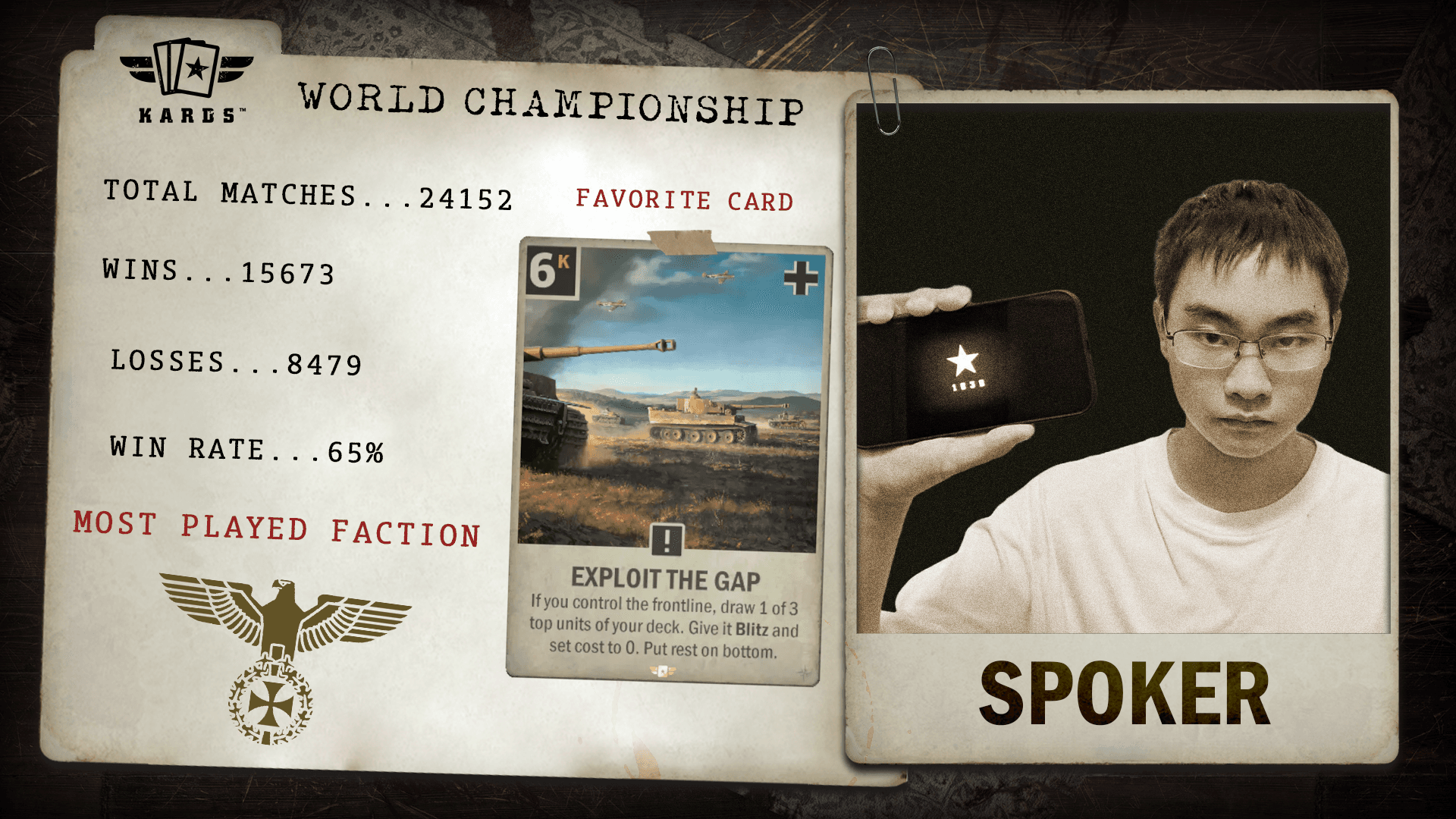 Powracając jako aktualny mistrz świata, Spoker zapewnił sobie miejsce wśród elity. Z wyjątkowym rekordem 15673 zwycięstw i wskaźnikiem wygranych na poziomie 64,9% w ponad 24000 meczach, Spoker pozostaje jednym z najbardziej spójnych zawodników w historii KARDS.