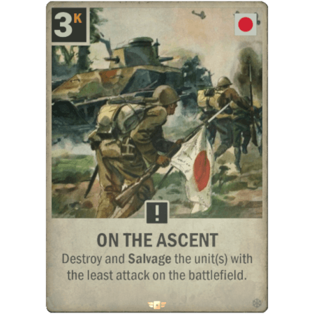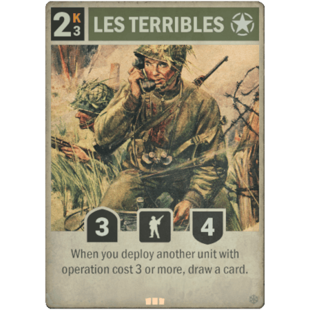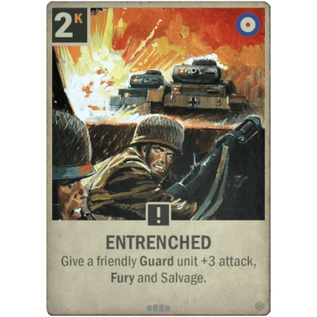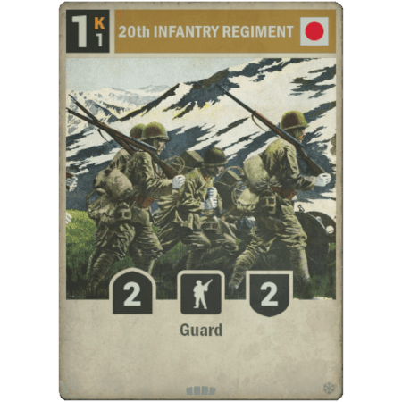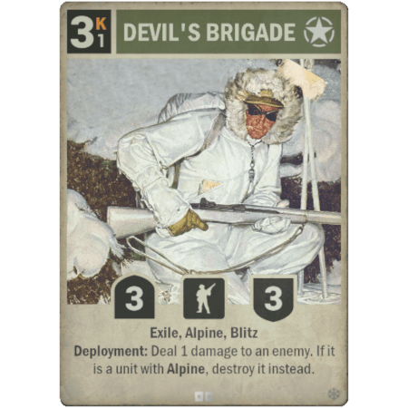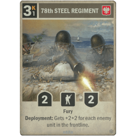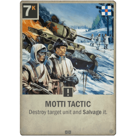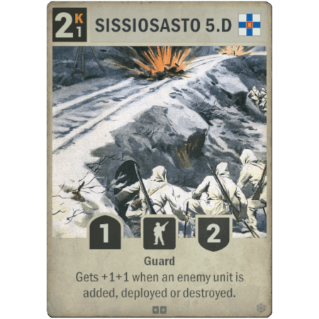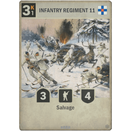 The I. STRIDSGRUPPEN is a Finnish infantry unit of Limited rarity. It has 1 attack, 4 defense, costs 2 kredits to play and 2 kredits to operate. It has the new Salvage keyword, and has +2 attack against units with higher attack.