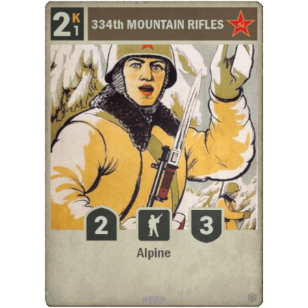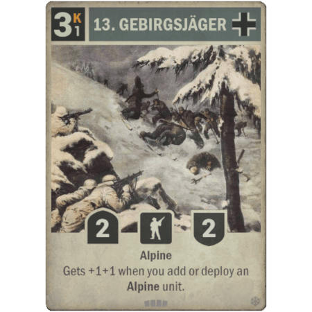 The 139. GEBIRGSJÄGER is a German Infantry unit of Special rarity. It costs 4 kredits to play and 1 kredit to operate. It has 3 attack, 4 defense, is an Alpine unit, and has the ability to deal 2 damage to the enemy HQ when you add or deploy an Alpine unit.