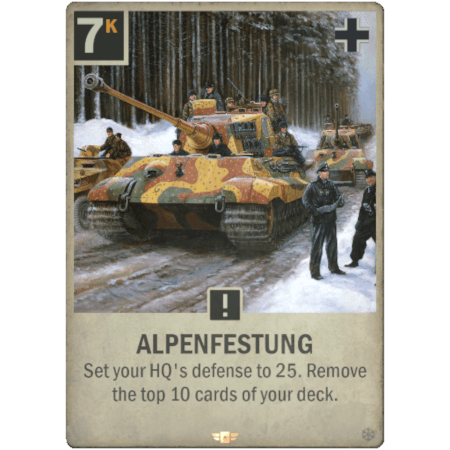 The FIAT BR.20 is an Italian Bomber of Special rarity. It costs 4 kredits to play and 2 kredits to operate. It has 2 attack, 2 defense, and the deployment effect to add two 3rd ALPINI REGIMENT to your support line.