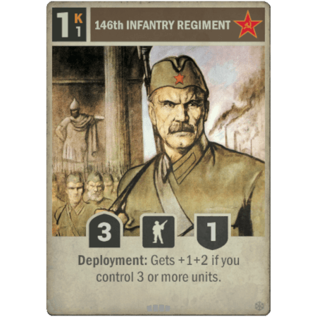 The 122nd KORSUN is an Elite rarity Soviet infantry unit. It costs 6 kredits to play and 1 kredit to operate. It has 5 attack, 7 defense, has the Guard ability, and costs 1 less to deploy for each of your units.