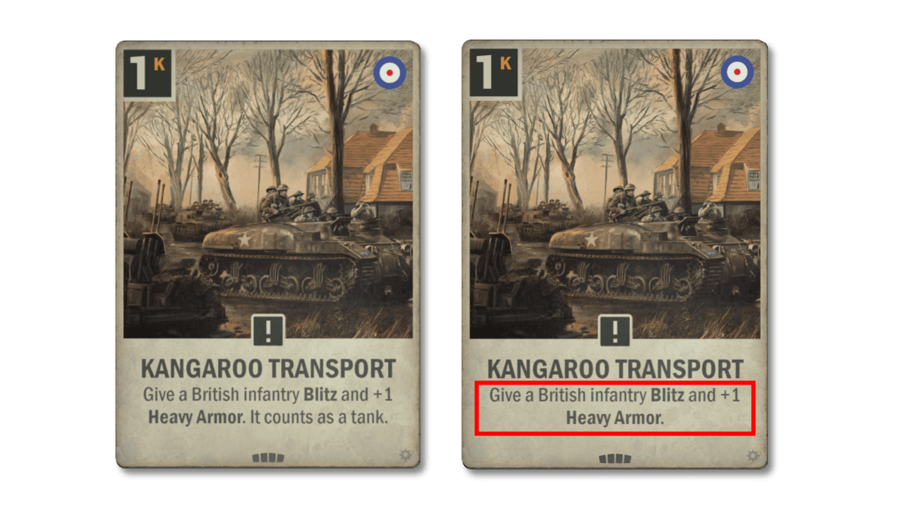 Novo: Dê a uma unidade de infantaria britânica Blitz e +1 de Blindagem Pesada.