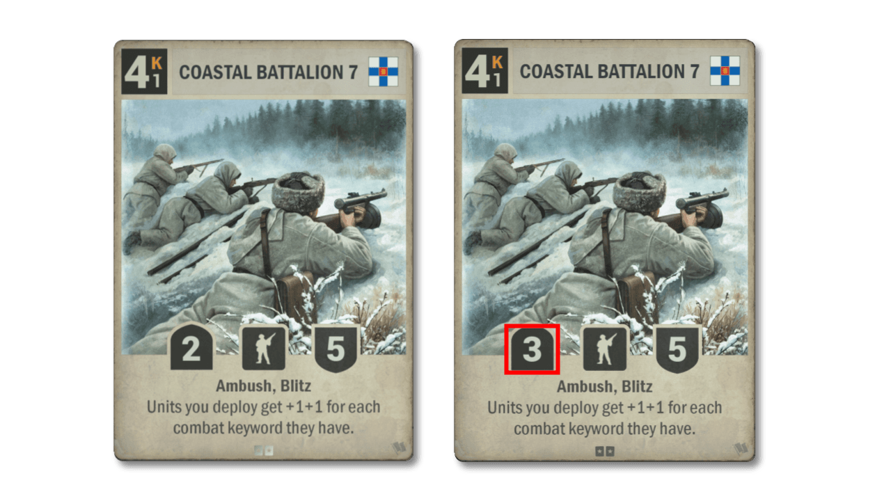 A mudança final é para uma das novas cartas finlandesas na Frente Interna. A Finlândia oferece algumas opções fortes para o baralho de Sopa Soviética, e queremos fortalecer ainda mais essa aliança frágil. O Batalhão Costeiro tem uma habilidade muito forte, mas, pelo visto, faltava um pouco. Agora tem uma mordida maior, tornando a sopa um pouco mais picante.