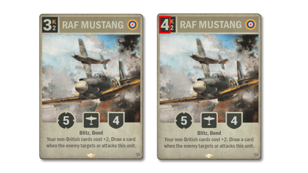 O Raf Mustang, com atributos agressivos, vem acompanhado de uma desvantagem significativa: tornar suas cartas não britânicas muito mais caras. No entanto, na prática, essa desvantagem costuma ser irrelevante, pois o Mustang é tão eficiente em encerrar as partidas rapidamente. Por isso, estamos ajustando levemente seus atributos, tornando-o 4K. Ele continua sendo uma ameaça poderosa, mas não mais o finalizador insano que é atualmente.