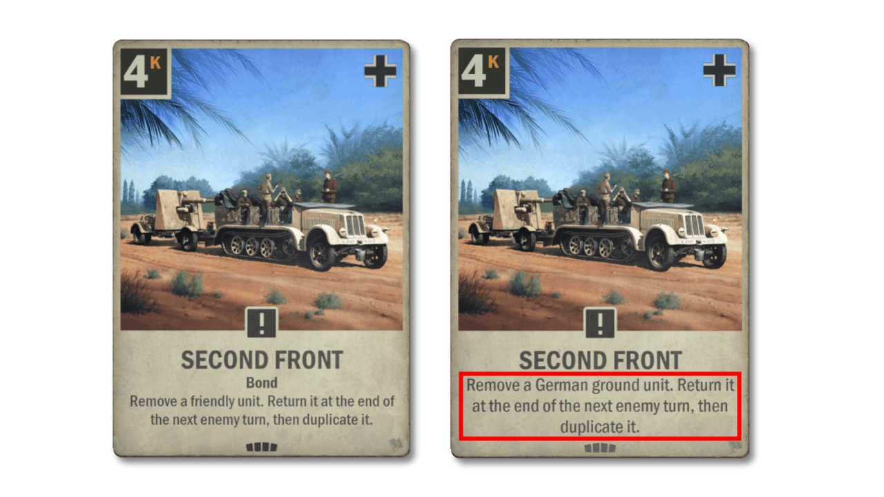 A versão alterada mantém a poderosa capacidade de duplicação e as unidades ainda entram no turno do inimigo, prontas para serem usadas por conta própria. A grande diferença são as maiores restrições sobre o que pode ser direcionado. A Alemanha possui muitas unidades terrestres poderosas, portanto ainda há bastante espaço para experimentação, mas os potenciais de OTK (morte em um turno) ficam severamente limitados. Observe que não há mais uma restrição quanto a alvejar uma unidade aliada; portanto, em teoria, é possível usar isso em uma unidade inimiga. Veremos uma segunda vinda da Segunda Frente? Só o tempo dirá.