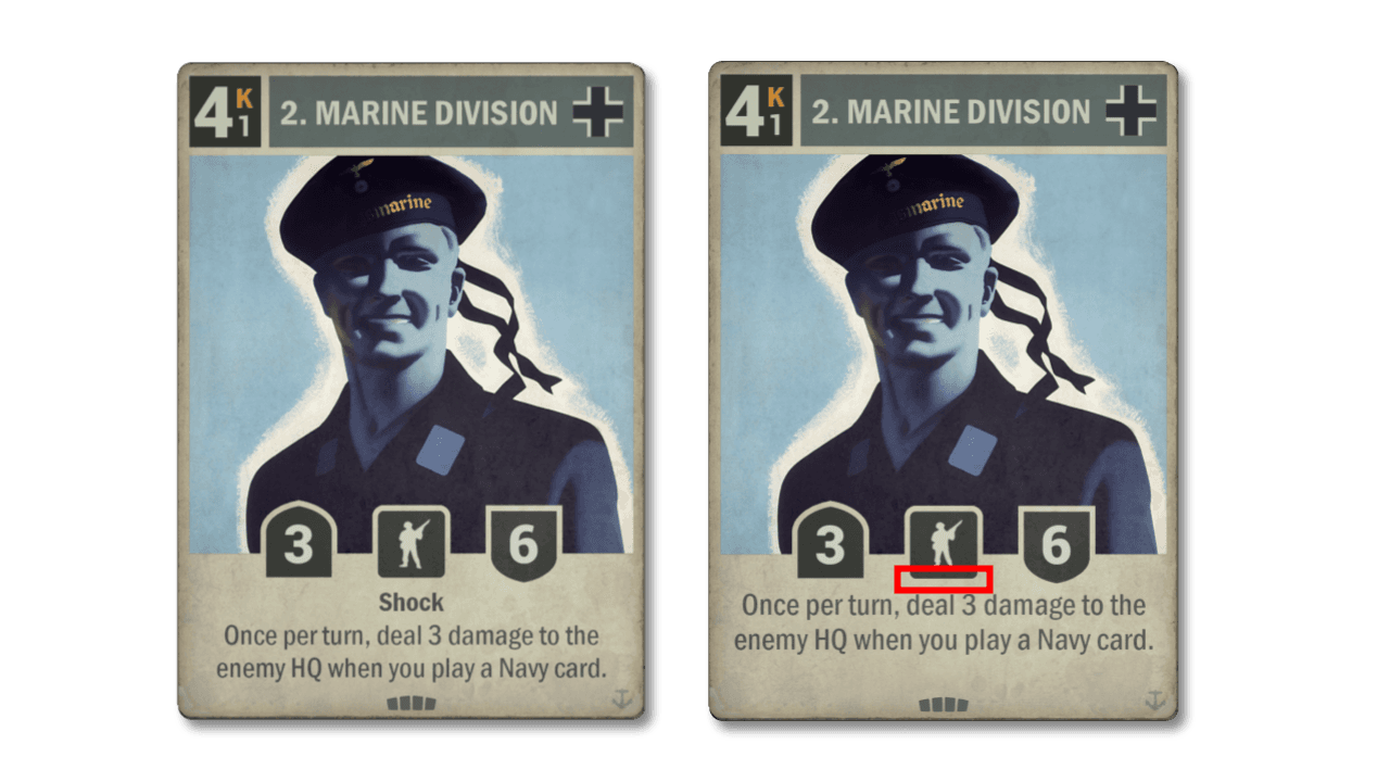 O Navy Burn é um dos decks que atualmente opera mais à margem, já que o deck Segunda Frente–Bretagne domina o meta. É um dos decks que se beneficiarão do nerf em Segunda Fremte, por isso, antecipando uma possível alta de sua popularidade, estamos aplicando um nerf bem leve na 2. DIVISÃO DE FUZILEIROS NAVAIS A perda de Choque não afeta seu propósito principal, mas torna sua presença no tabuleiro um pouco menos ameaçadora.