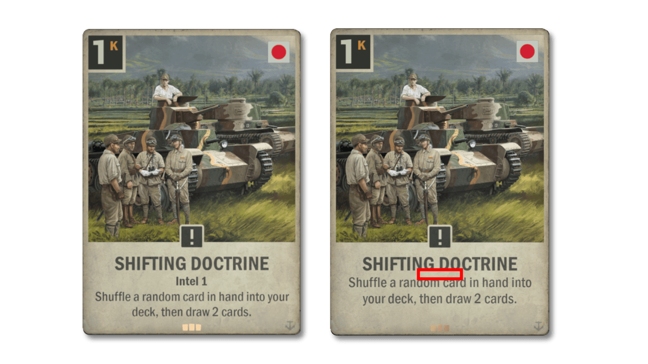 Outros dois decks ansiosos pelo declínio da Segunda Frente são Jintel e Embaralhar (Shuffle). Em ambos os decks, Mudança de Doutrina desempenha um papel importante; por isso, estamos nerfando essas estratégias de forma preventiva ao remover Inteligência 1 da carta. Isso machuca principalmente Jintel, mas, no geral, a carta está significativamente mais fraca agora, então veremos se os jogadores se afastarão das informações e/ou embaralharão as doutrinas no futuro.