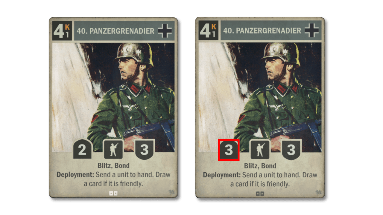 Fomos intencionalmente muito cuidadosos com os temas de rejeição/remoção do campo de batalha da Alemanha e do Japão na Frente Interna, pois tais estratégias podem rapidamente se tornar muito frustrantes de enfrentar. Embora não desejemos ver essas estratégias nos baralhos de Nível 1, ainda queremos apoiá-las o suficiente para sermos viáveis. Com isso em mente, estamos melhorando uma das cartas fundamentais desta estratégia em 40. Panzergrenadiers. Seu efeito de posicionamento é muito poderoso, mas suas estatísticas eram um pouco insuficientes. Agora que representa uma ameaça maior, ela deve entrar em mais baralhos.