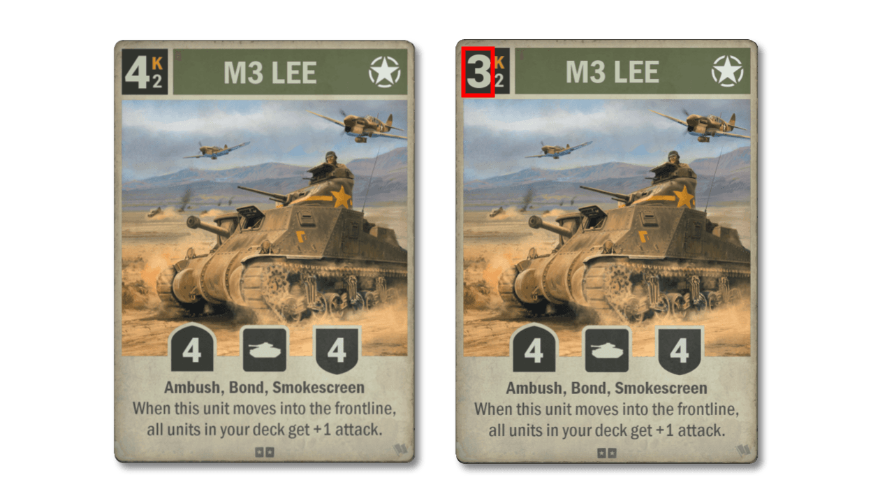 A estratégia de unidades de buff nos decks teve sucesso limitado em cartas como USS The Sullivans e Os Profissionais. Em certa medida, o arquétipo é contido pela Segunda Frente, então agora ele tem uma chance maior de florescer. Ainda assim, o M3 Lee provou ser um pouco lento, então estamos reduzindo seu custo. Isso também a torna uma inclusão potencial em baralhos de unidades com 4 de ataque, por exemplo, junto com o 12º Guardas Mecanizados.