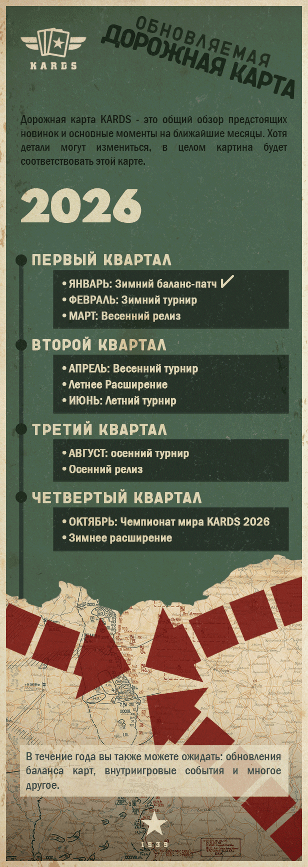 В ней не перечислены обычные патчи, небольшие обновления, изменения баланса или внутриигровые события. Это все еще очень важная часть нашей работы по улучшению KARDS, но дорожная карта предназначена для того, чтобы быть читаемой и сосредоточенной на всей кампании, а не на каждой отдельной операции.