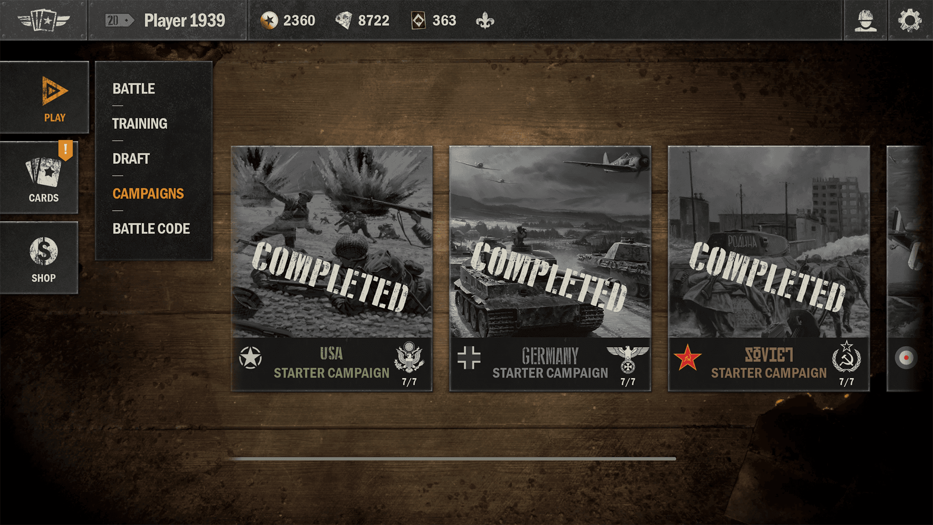 After completing the initial US or German training campaigns, you can try out Battle (PVP) directly and/or other parts of the game. However, we recommend completing the Starter campaigns for each of the other main nations early on, as it’s a great way to get to know all the nations as well as collecting a bunch of cards. This will in turn help you improve your starter decks greatly (See tip 2 below).