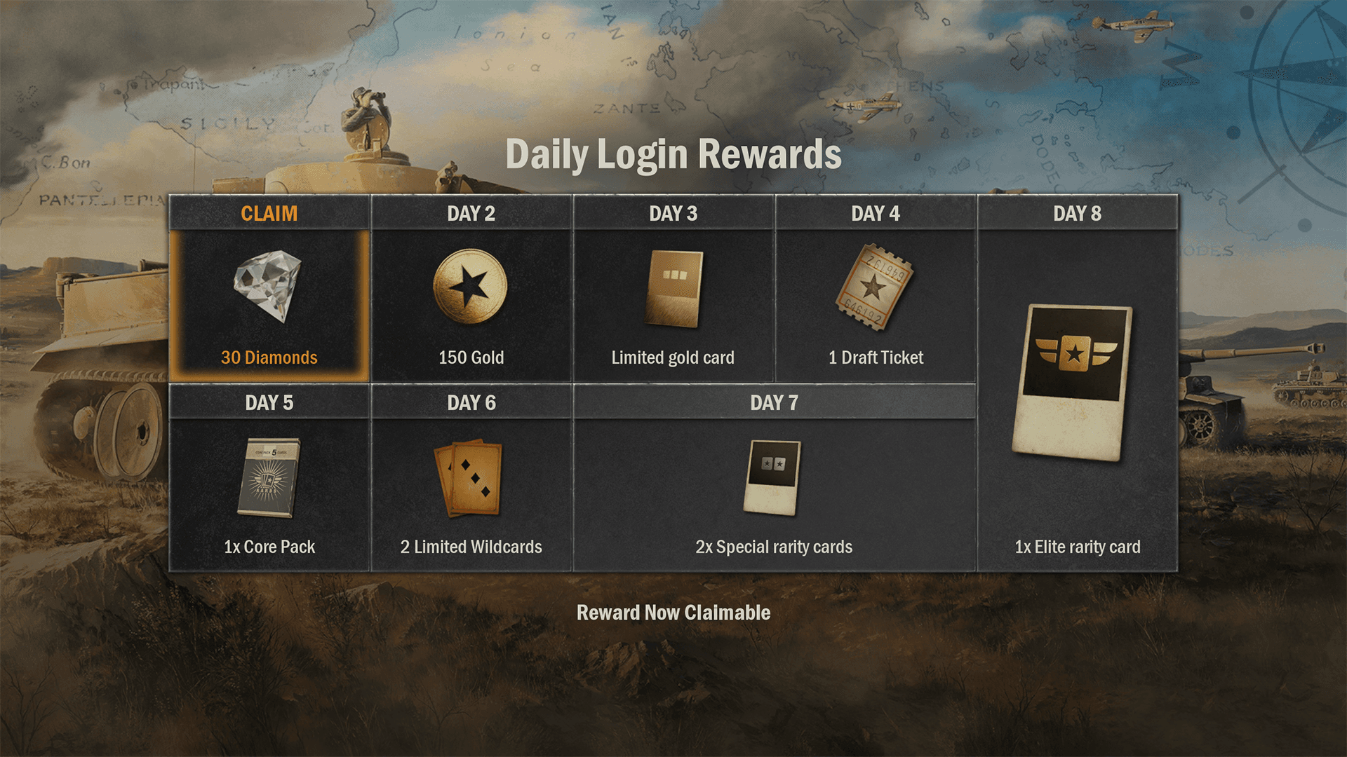 Remember to collect your first week daily login rewards every day to collect diamonds, packs, elite cards and much more. This greatly helps you jumpstart your Kards journey.