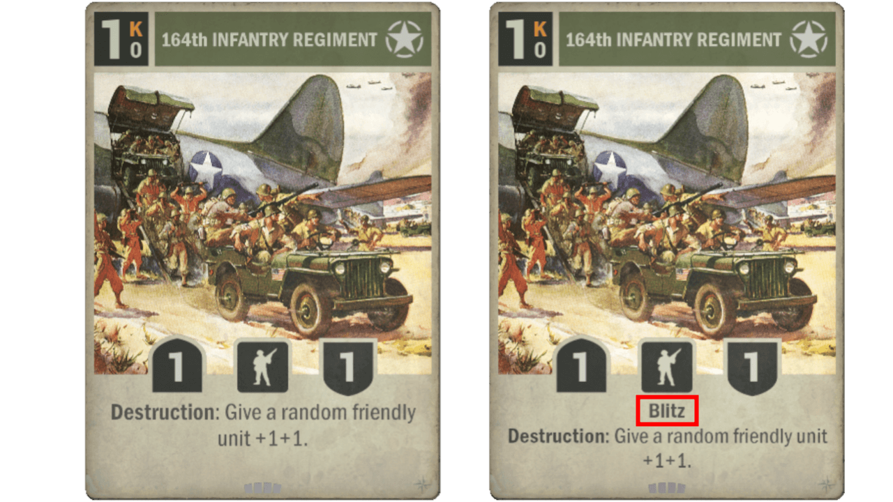 第 164 步兵團在瓜達爾卡納爾島戰役中經歷了激烈戰鬥,擁有豐富的叢林戰經驗。我們覺得可以讓這個單位KARDS中多多表現,使它在美國前線等卡組中更有用。因此,我們給這個單位添加了閃擊,這將更好地體現其在戰鬥中的實力,並允許在主流卡組中有更高的出場率。