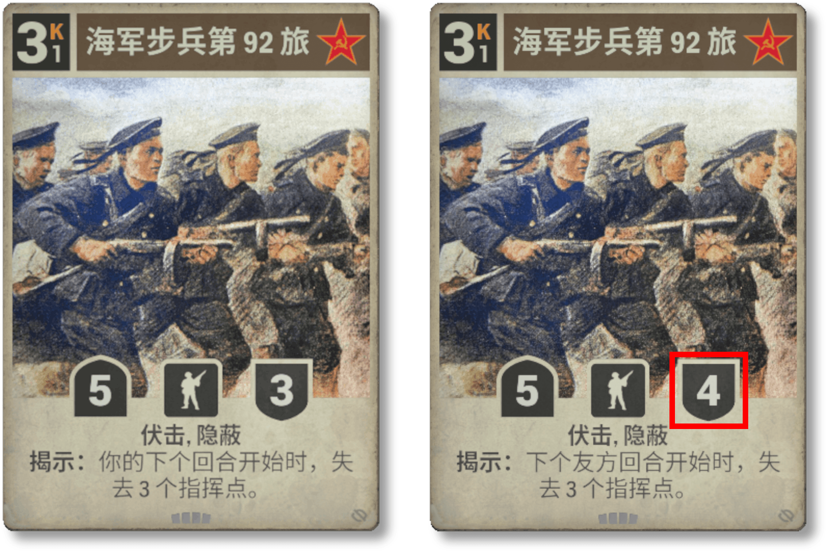 这张牌在秘密行动推出前经历的测试调整可能比其他任何卡牌都要多,防御力在 3 到 5 之间变换,而失去的指挥点曾在 2 到 4 之间浮动。最后的出厂版本相当保守,因为我们并不希望隐蔽卡组过于强大。但事实并非如此,虽然卡组相当不错,但仍有小小改进的空间。更强大的海军步兵将有更多机会潜入环境,催生美妙的反应。