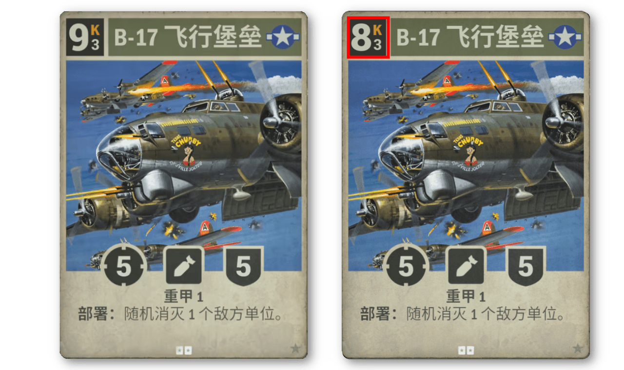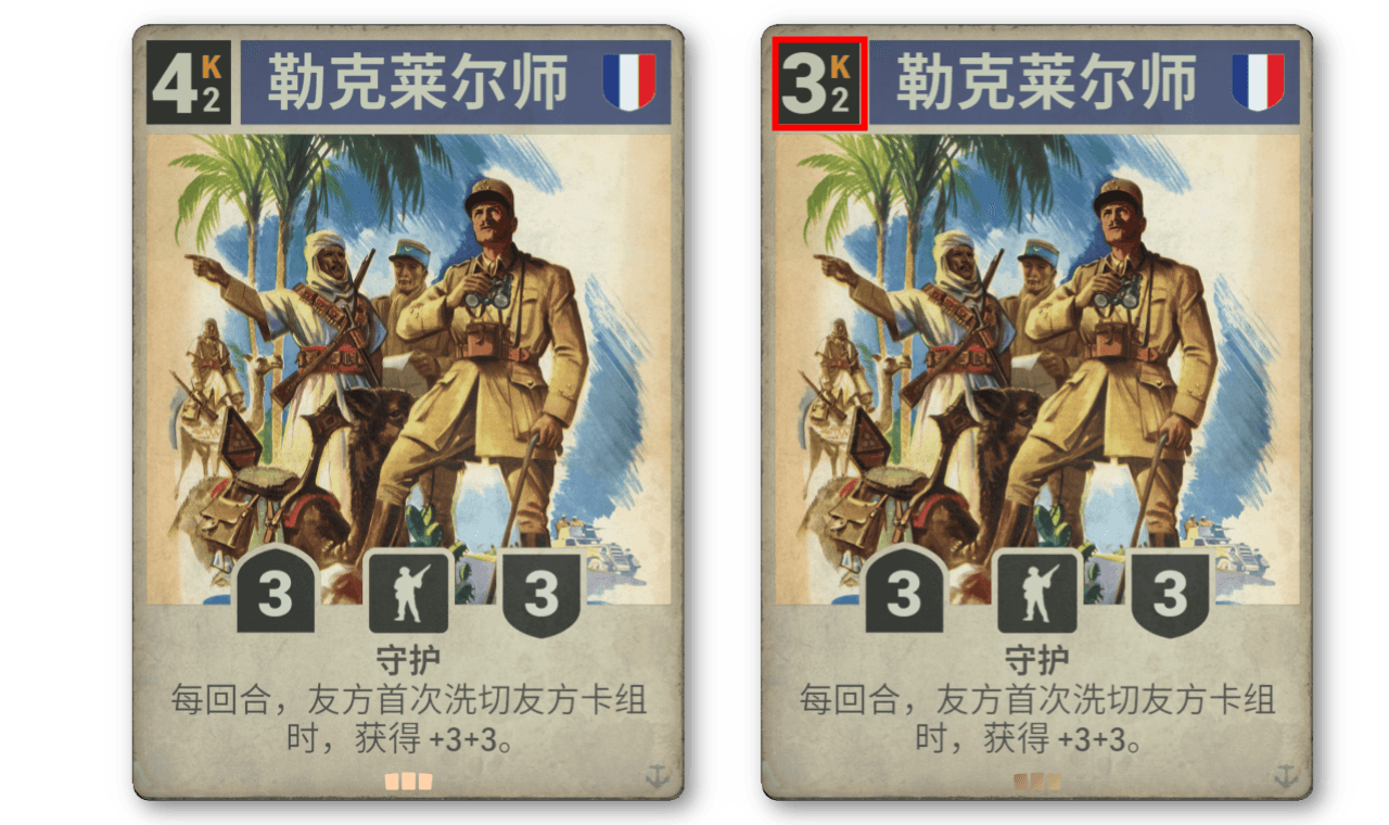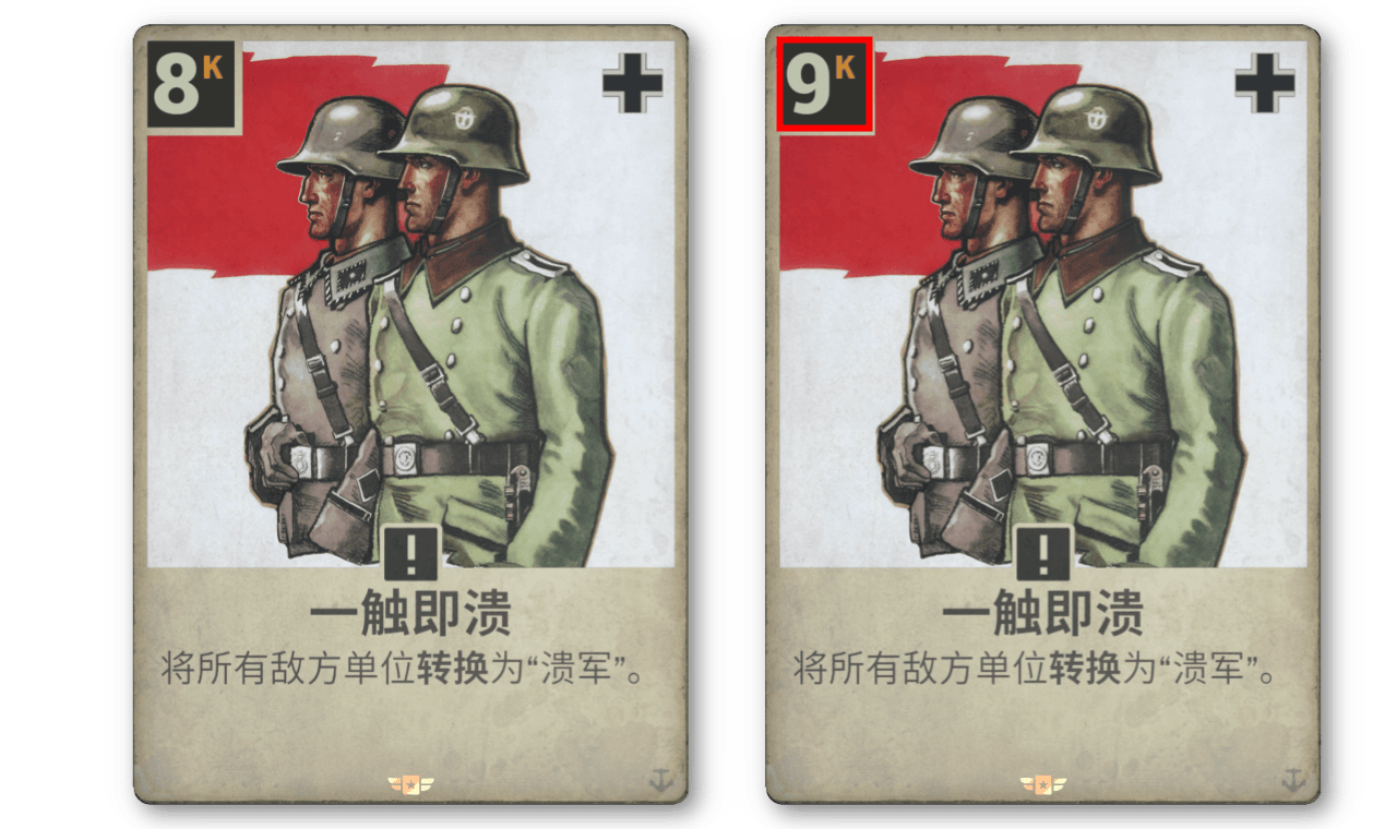 新:对抗陆军或攻击总部时,具有 +2 攻击力。部署:与 1 个敌方单位战斗。