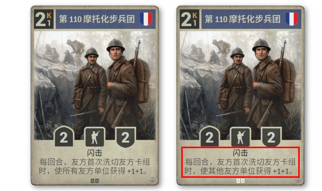 现在我们迎来了第二项洗切削弱。8 月补丁之后,日法洗切一步登天,事后看来,我们给得太多了。这套牌依旧很有趣,我们不想把它砍死。现在该单位不再能强化自身,即使场面顺风顺水,也更容易被处理。