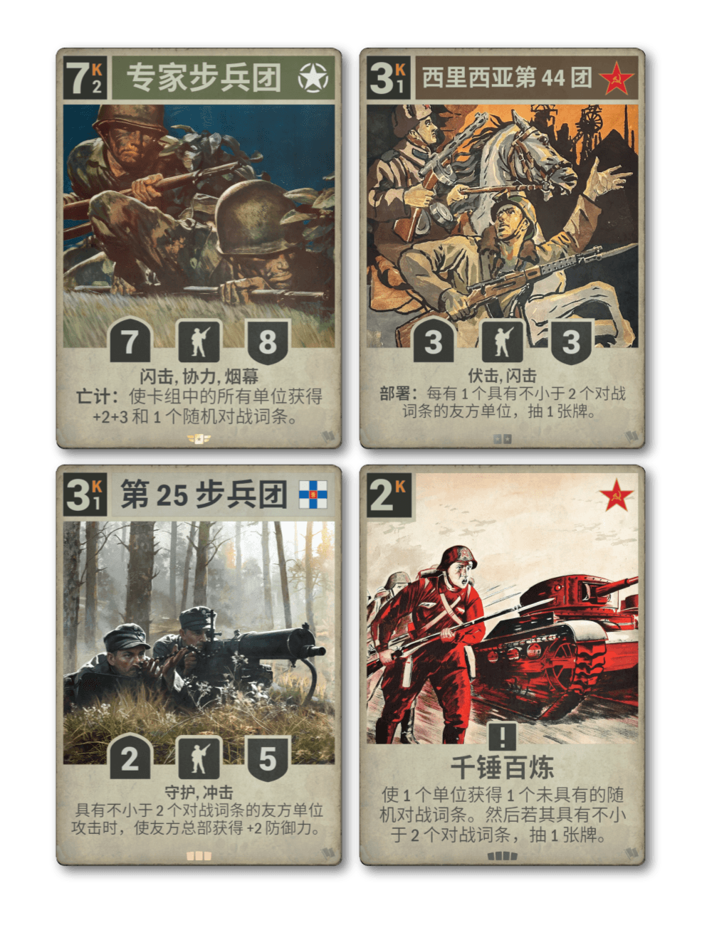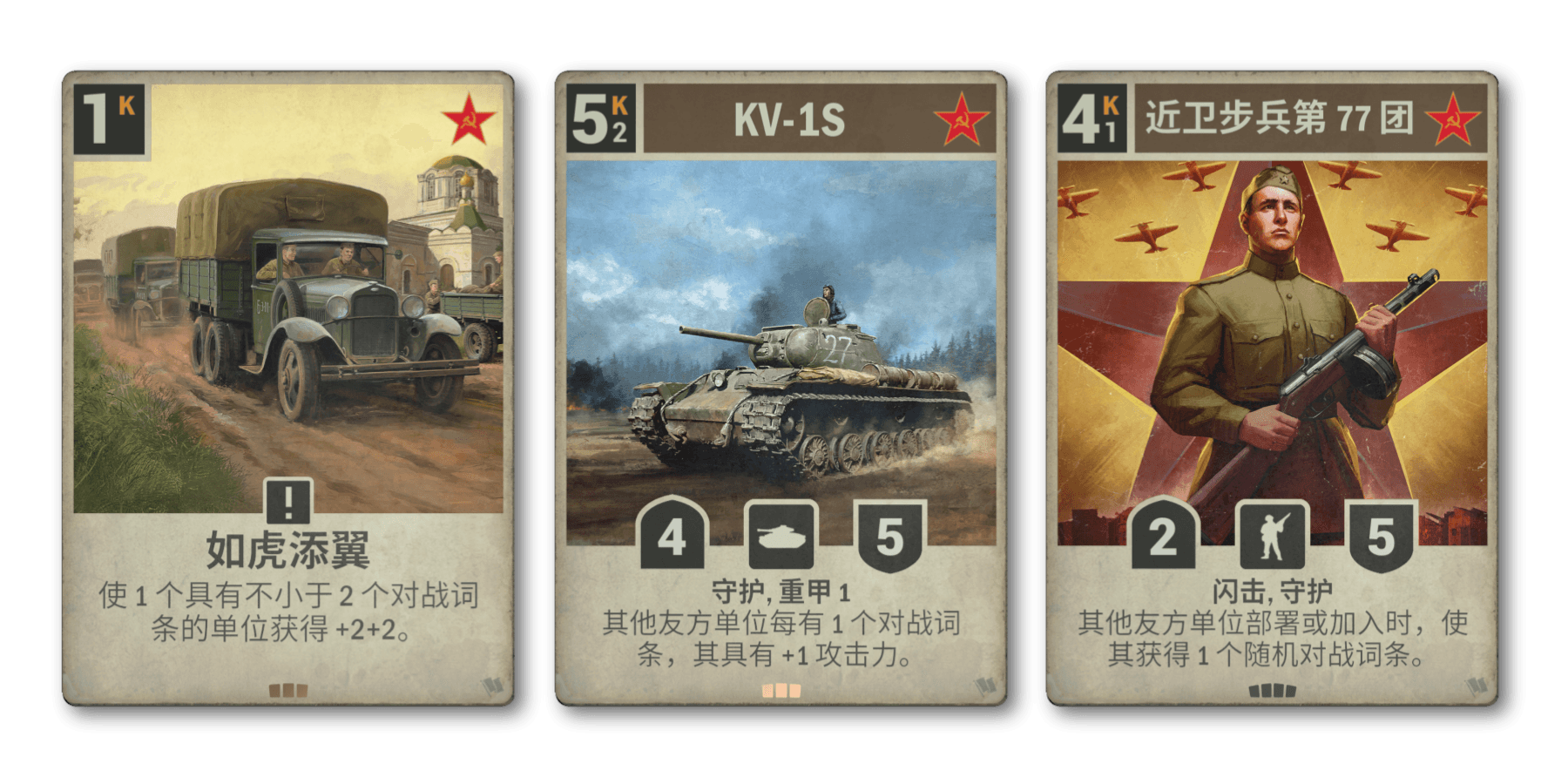 如虎添翼、KV-1S 和近卫步兵第 77 团等卡牌很好地展示了此机制的运作方式 - 以词条数量定义效果范围,亦或是在对局中赋予词条。