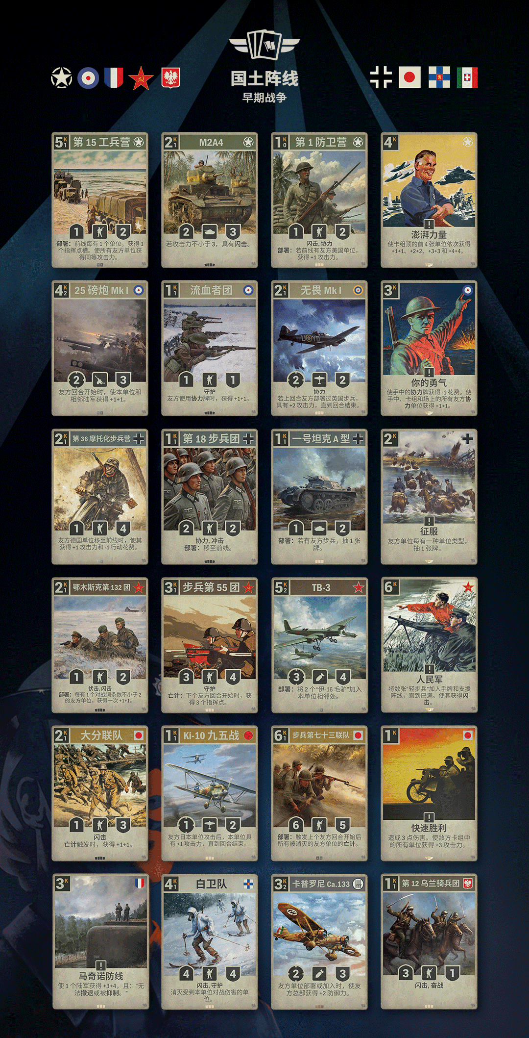 国土阵线:早期战争迷你套装将引入 24 张全新卡牌:每个主国各 4 张,每个盟国各 1 张。