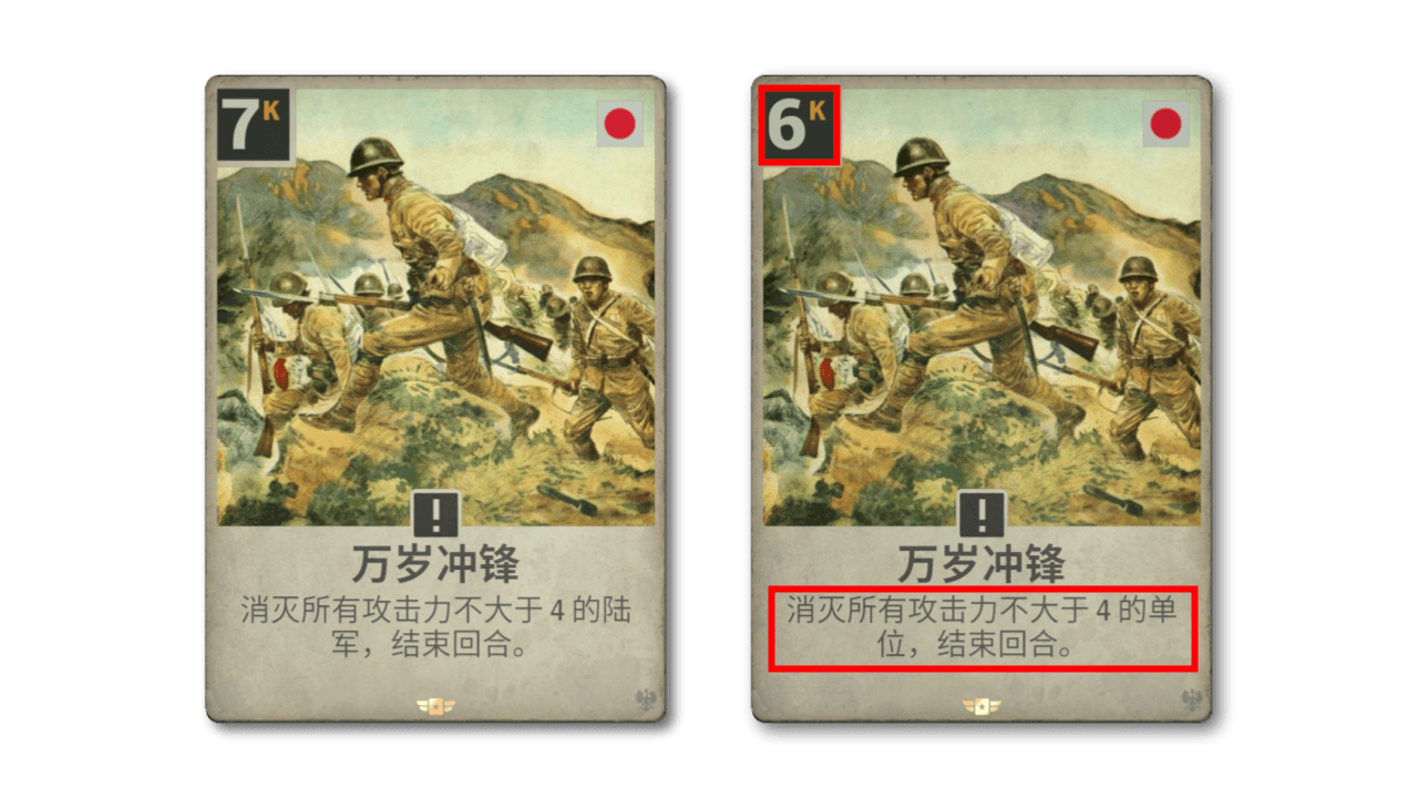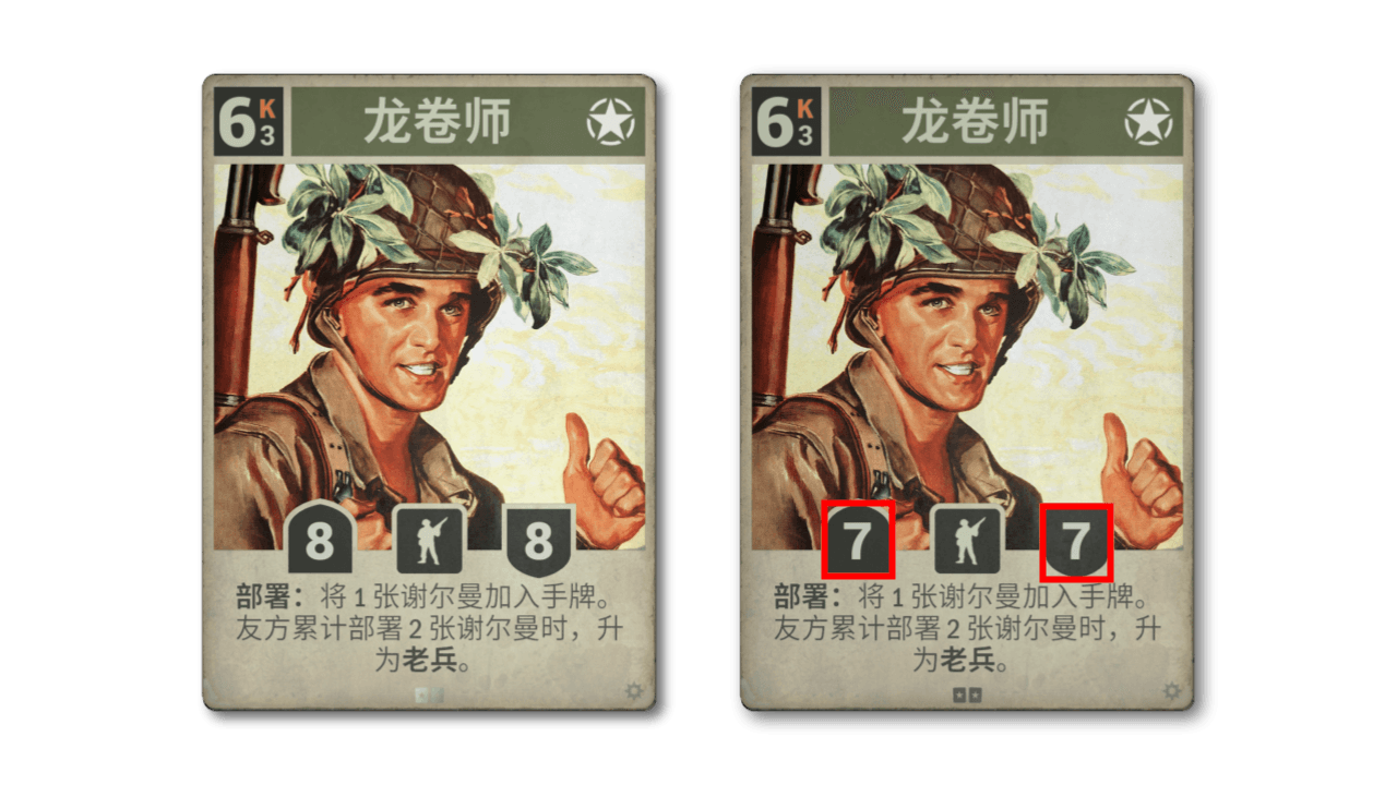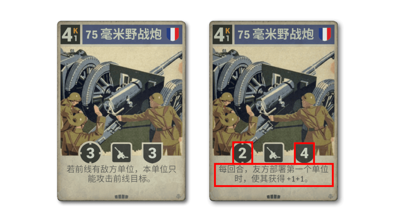 法国卡牌在主流卡组的投入率一直表现不俗,但 75 毫米野战炮显然不在其中。虽然它作为火炮身材还不错,但其负面效果与目前的法国战略格格不入,更不用说其效果与炮兵的特性背道而驰。新版效果更符合法国主题,虽然打击力不如以前,但它获得了更好的持久性。